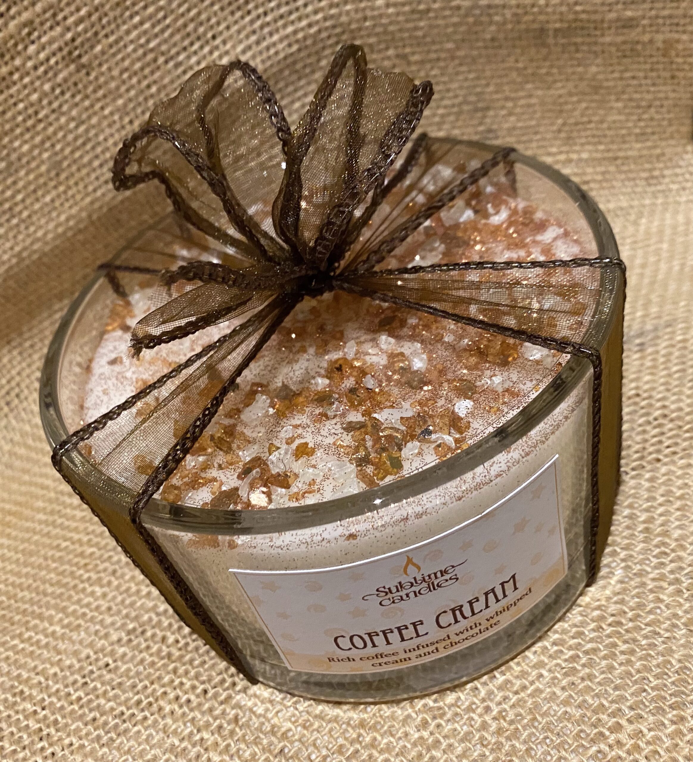 Our Coffee Cream candle is a delicious rich coffee infused with whipped cream and chocolate – totally scrumptious! Burn time approx. 40+ hours.